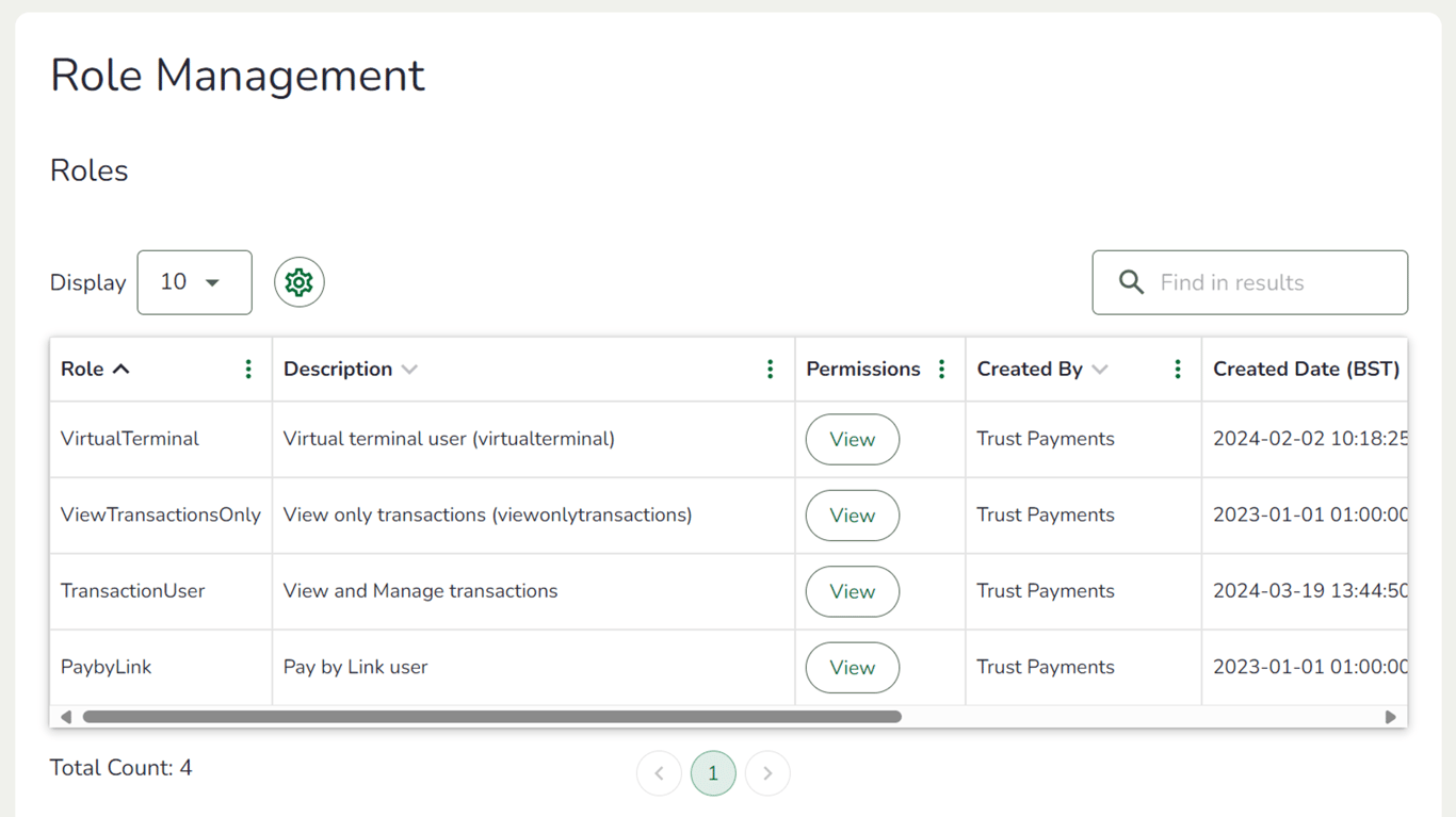 Under the "Permissions" column, select "View" to see a list of actions that users assigned this role can perform, or features they have access to.