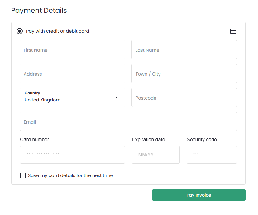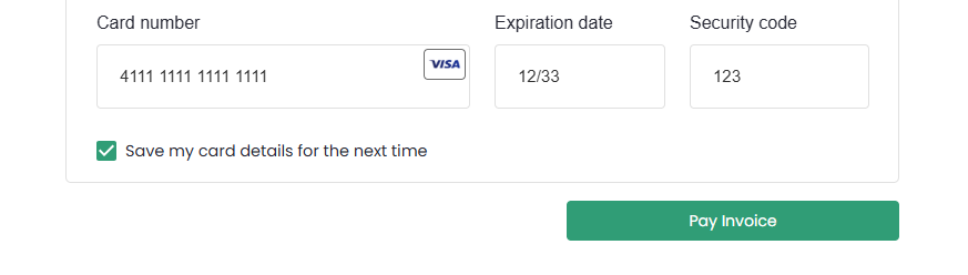 When paying with a new card, you have the option to save your card for future invoice payments. To save a card, you must check the box "Save my card details for the next time" and your invoice payment must be processed.