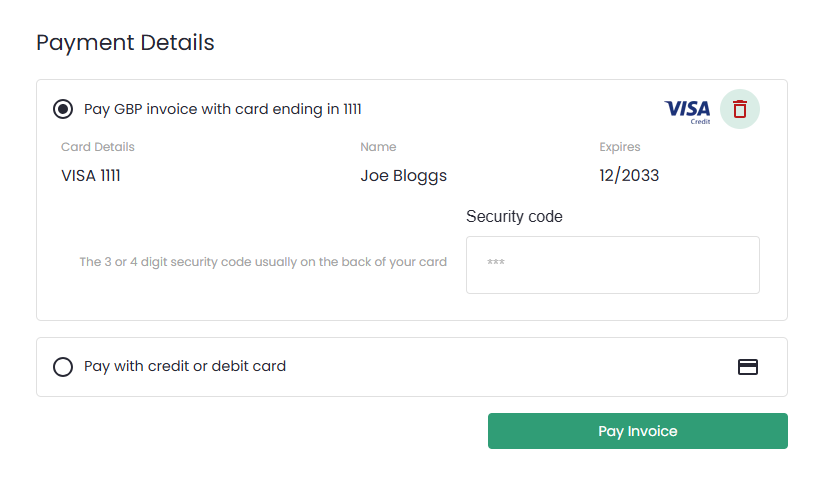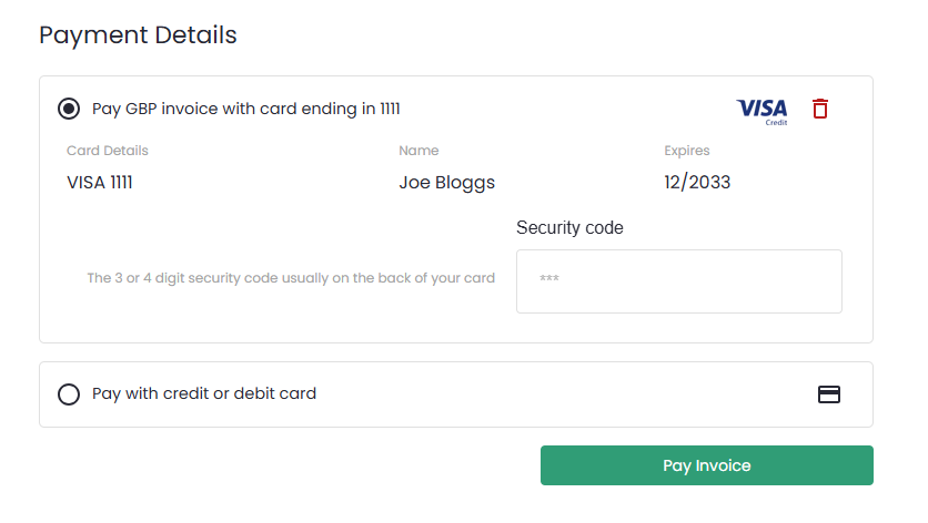 To pay with a saved card, you must have previously agreed to store your credentials when you last paid for an invoice with a credit or debit card. Complete the Invoice Details section and select "Pay <Currency> invoice with card ending in ****".