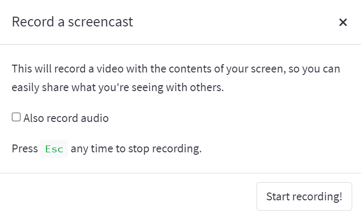 In the overlay displayed, tick "Also record audio" if you would like to record a commentary using a connected microphone, otherwise select "Start recording!" to continue.