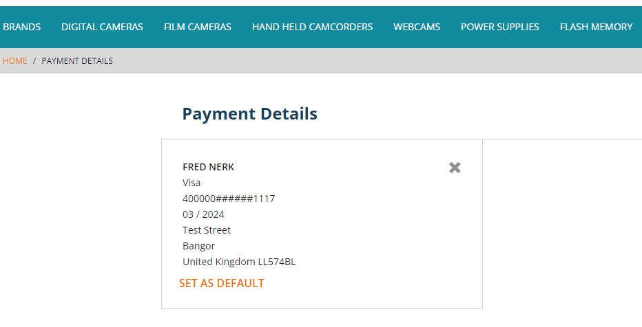 Customers can also view their previously-stored cards on their account's “PAYMENT DETAILS” page: