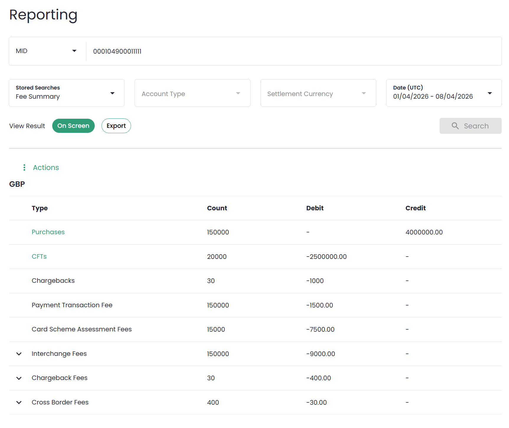 Het rapport "Fee Summary" geeft een overzicht van het totale aantal transacties, vergoedingen, aanpassingen en andere boekingen verwerkt via de geselecteerde MID over een periode van maximaal 31 dagen.