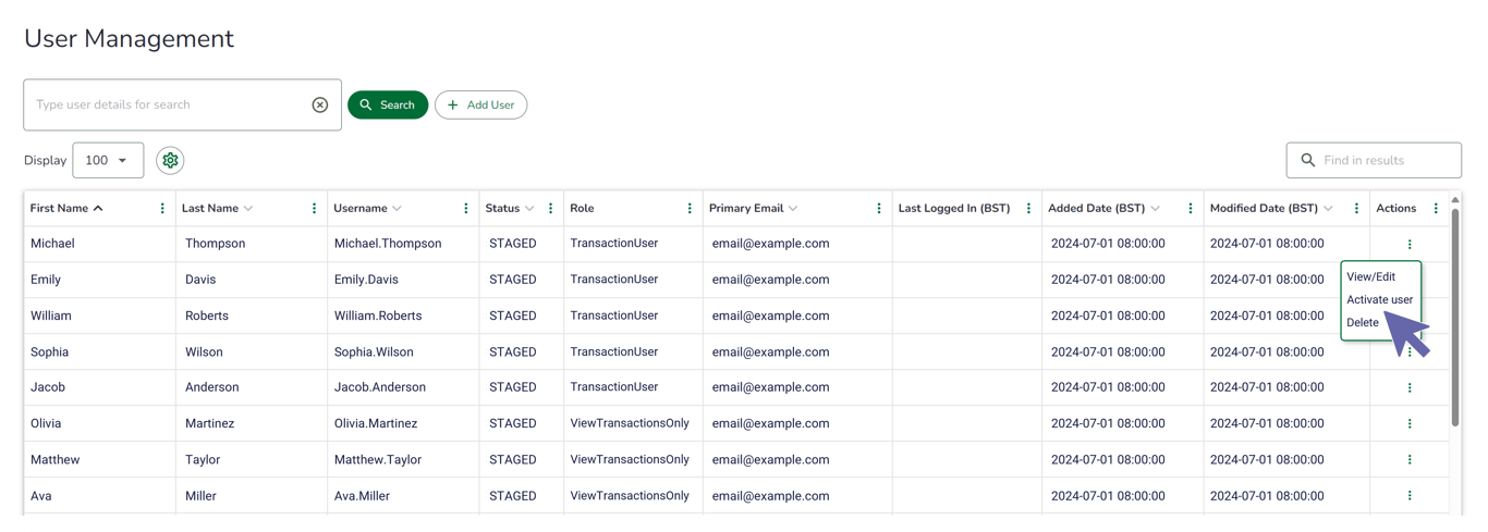 3. To the right of users to be migrated, select   under the Action column, then "Activate user" from the context menu that appears. When prompted, select "Confirm" from the dialog box to complete the action.