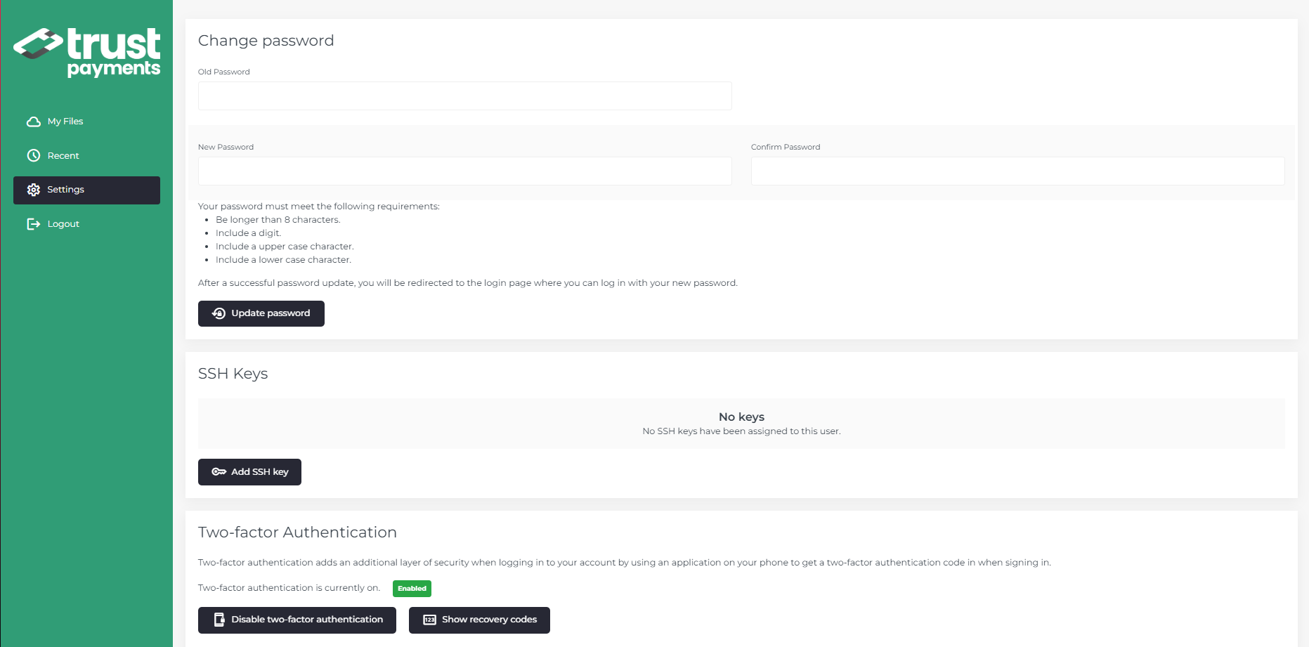 Screenshot of SFTP web client. "Settings" is selected on the left. Password, SSH Keys and 2FA settings are shown.