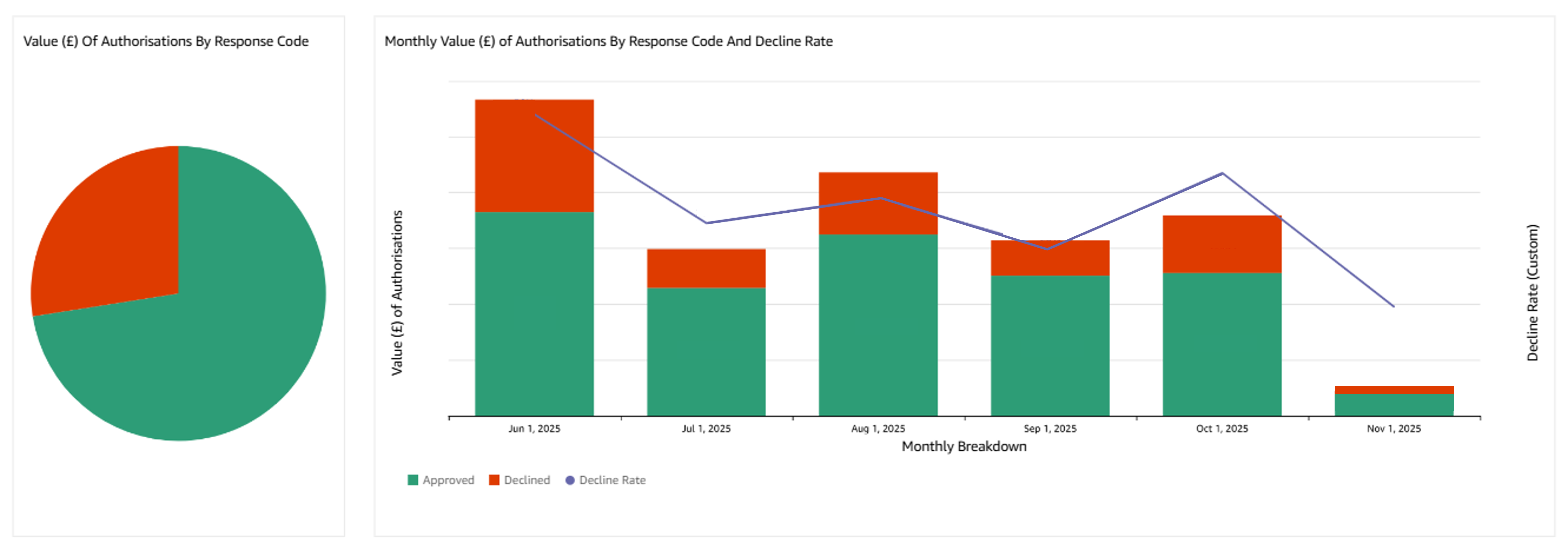De authorisaties biedt uitgebreide inzichten in de prestaties van je autorisatie en helpt je inzicht te krijgen in goedkeuringspercentages, afwijzingspatronen en de geografische spreiding van transactiepogingen. In dit gedeelte worden de verschillende onderdelen en statistieken van deze weergave beschreven.