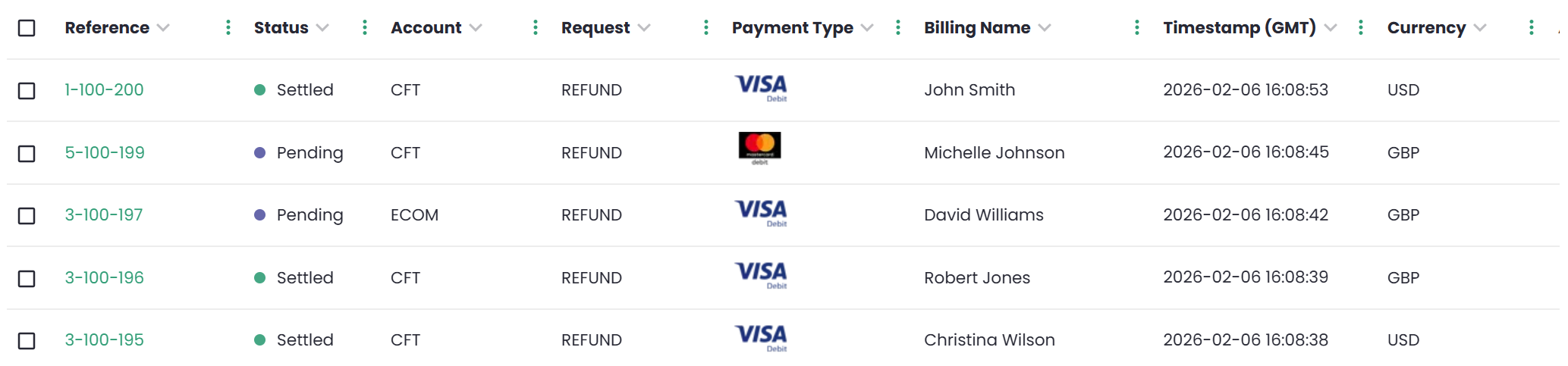 De opgeslagen zoekopdracht „Terugbetalingen“ geeft alle terugbetalingen en payouts weer payouts via de TRU Connect zijn verwerkt (inclusief geslaagde authorisaties, geweigerde transacties en eventuele fouten).