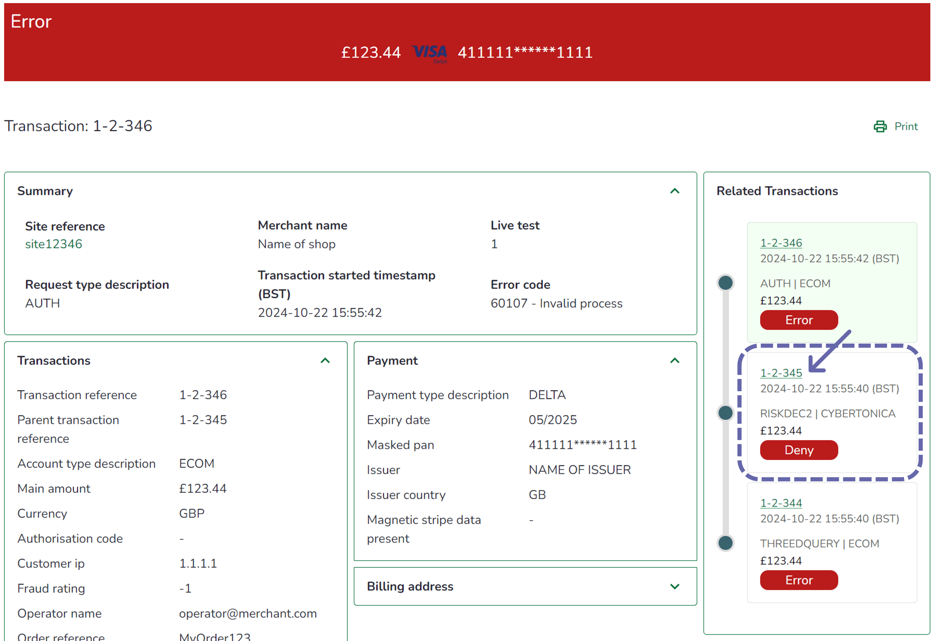 Als de Foutcode die onder het gedeelte Samenvatting wordt weergegeven "60107 - Ongeldig proces" is, geeft dit waarschijnlijk aan dat er een "DENY" antwoord is teruggestuurd door TRU Fraud Check en dat de transactie is geannuleerd vanwege een hoog frauderisico.