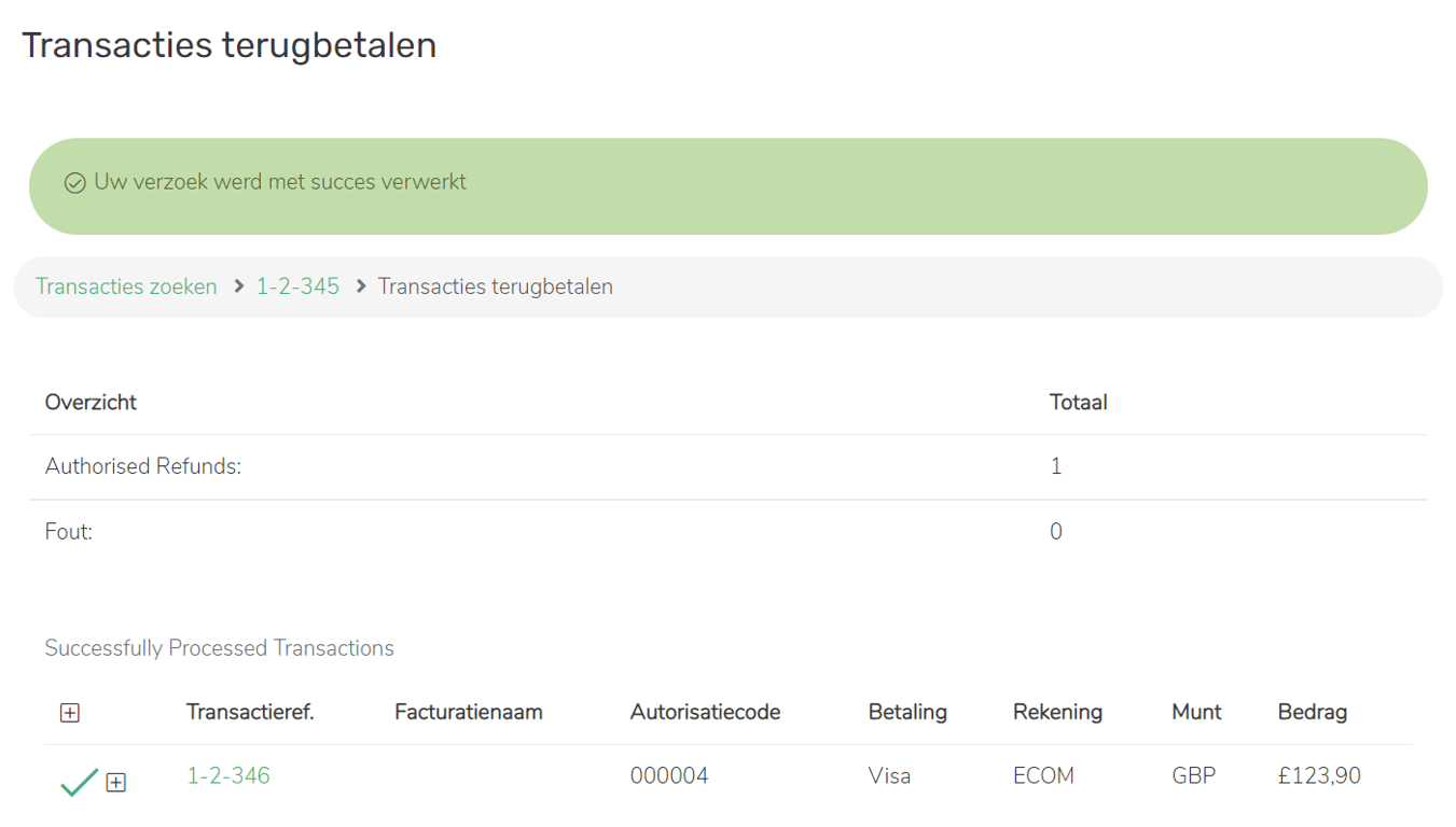 Indien succesvol, wordt de weergegeven pagina vooraf gevuld met de gegevens van de geselecteerde transactie(s).