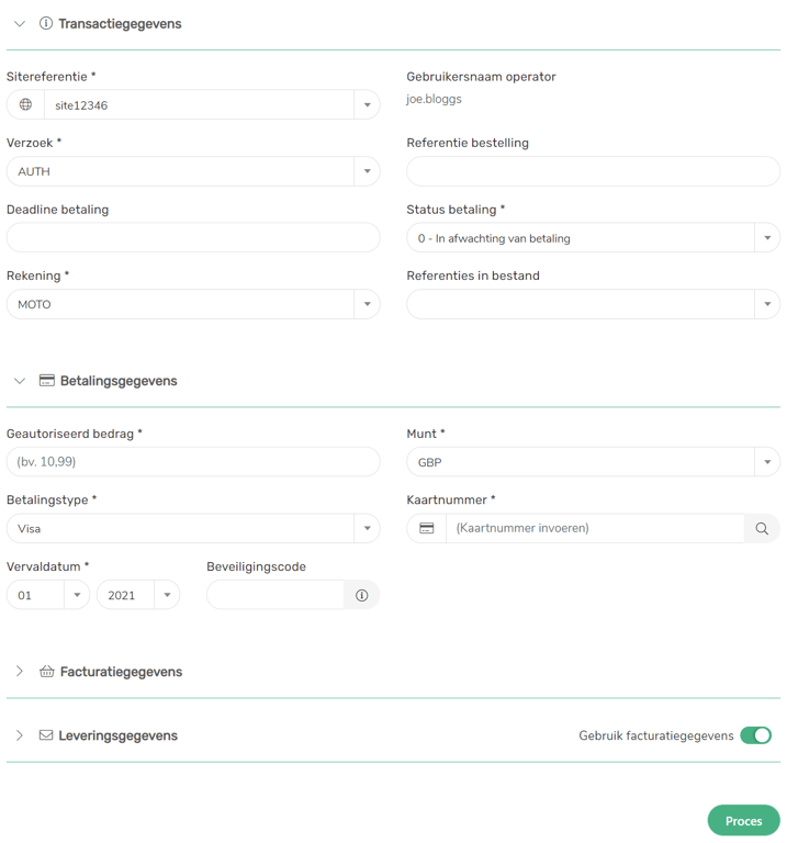 Vul het formulier in met de betalings-, facturatie- en leveringsgegevens van de klant en druk rechtsonder op de knop "Proces". Wij zullen een transactie verwerken met de verstrekte gegevens.