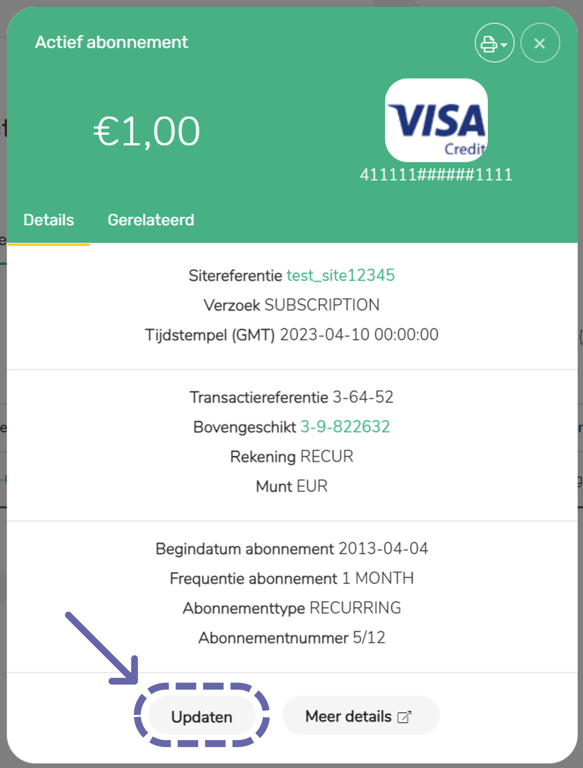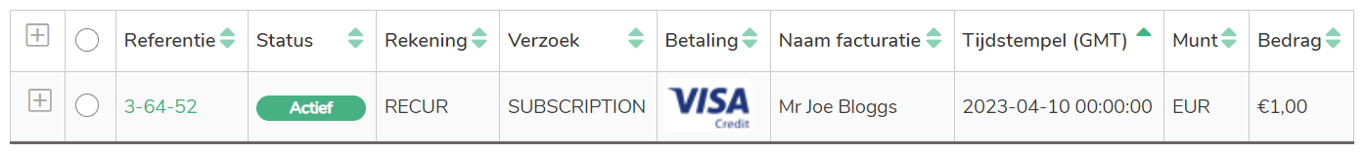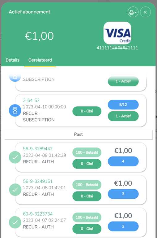 Opmerking: Als aa bb heeft overschreden, (bijv. "13/12") geeft dit aan dat er geen abonnementsbetalingen meer zullen worden verwerkt, omdat het eerder gedefinieerde totale aantal betalingen is overschreden.