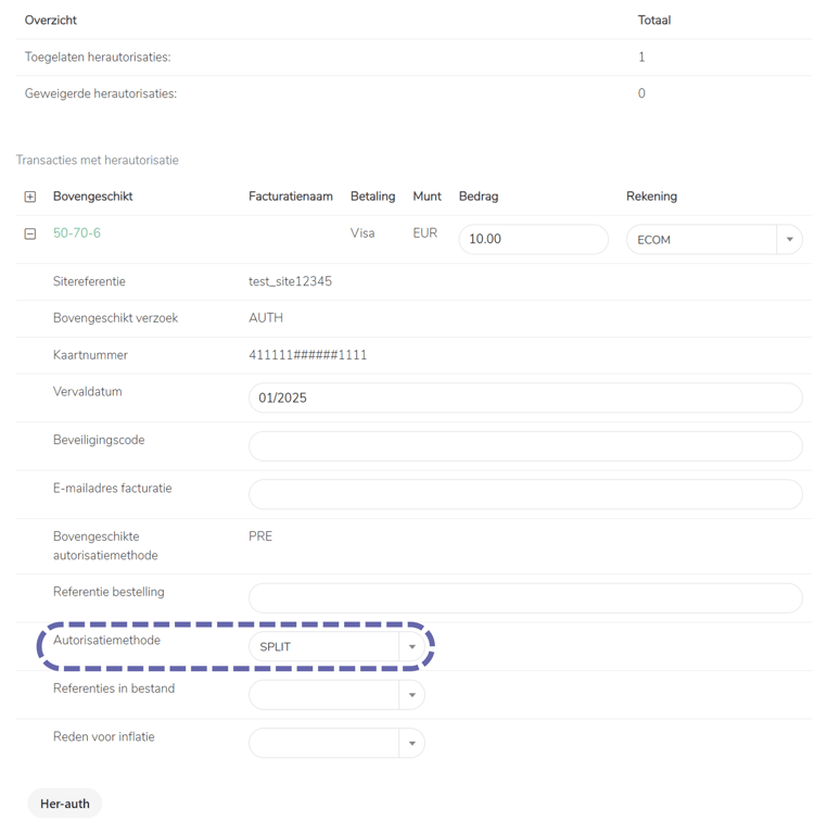Na deze stappen klikt u op de "Her-auth" knop onderaan de pagina om een gesplitste zending uit te voeren.