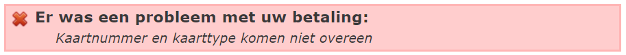 Als de klant kaartgegevens invoert die niet overeenkomen met het kaarttype, en een betaling probeert te verwerken, wordt de betaling niet verwerkt en verschijnt er een rode waarschuwing bovenaan de pagina.