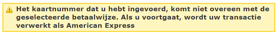 De betaling wordt verwerkt in de juiste Betalingstype zoals verwacht, maar de klant wordt niet vooraf geïnformeerd als de kaartgegevens die hij heeft ingevoerd niet overeenkomen met het type kaart dat hij op de betalingskeuzepagina heeft geselecteerd.