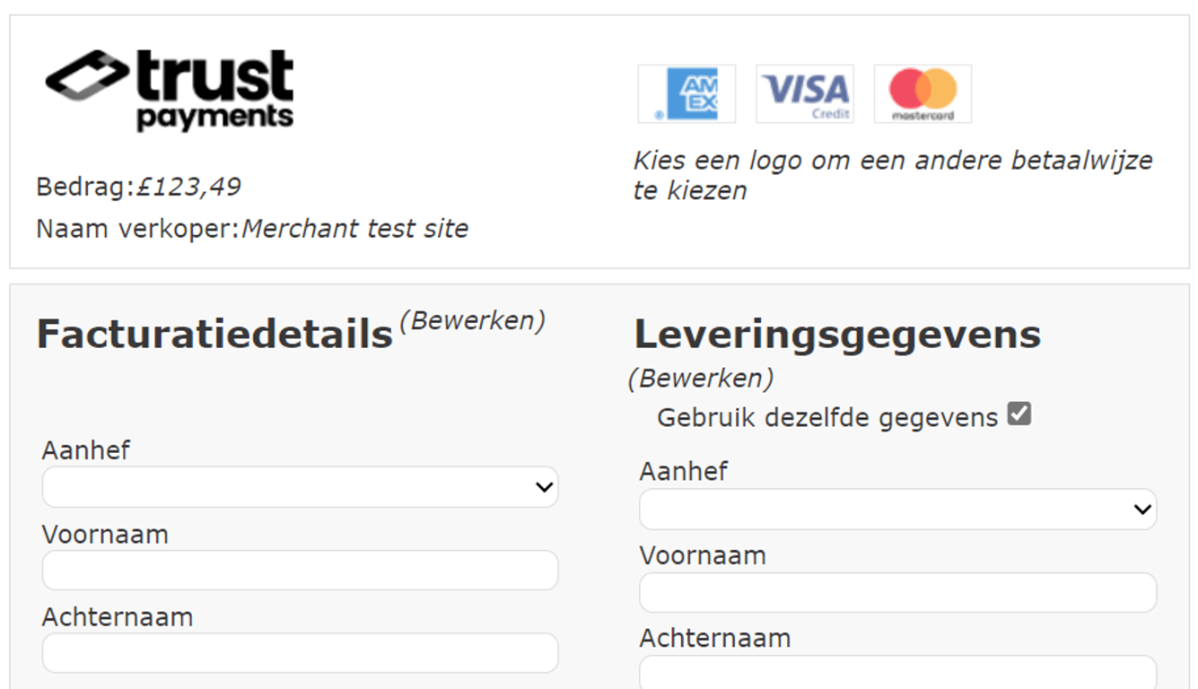 De klant moet opnieuw op "Veilig betalen" klikken om de betaling uit te voeren met het type kaart dat bij de eerder verstrekte gegevens hoort. Hij kan zijn adres- en betalingsgegevens wijzigen alvorens te betalen, of ervoor kiezen om met een andere Betalingstype te betalen door bovenaan de pagina een alternatief te kiezen.