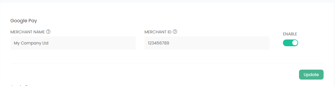 https://pay.google.com/business/console/ (link to external site). - Enable Google Pay using the toggle provided.