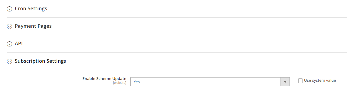 For merchants processing high volume recurring transactions, we recommend enabling Scheme updates (this can be enabled for specific products on your store). To do so, you will first need to contact our Support Team to enable Scheme updates on your Trust Payments account, and then return to the Adobe Commerce config page to enable Scheme updates, as shown below: