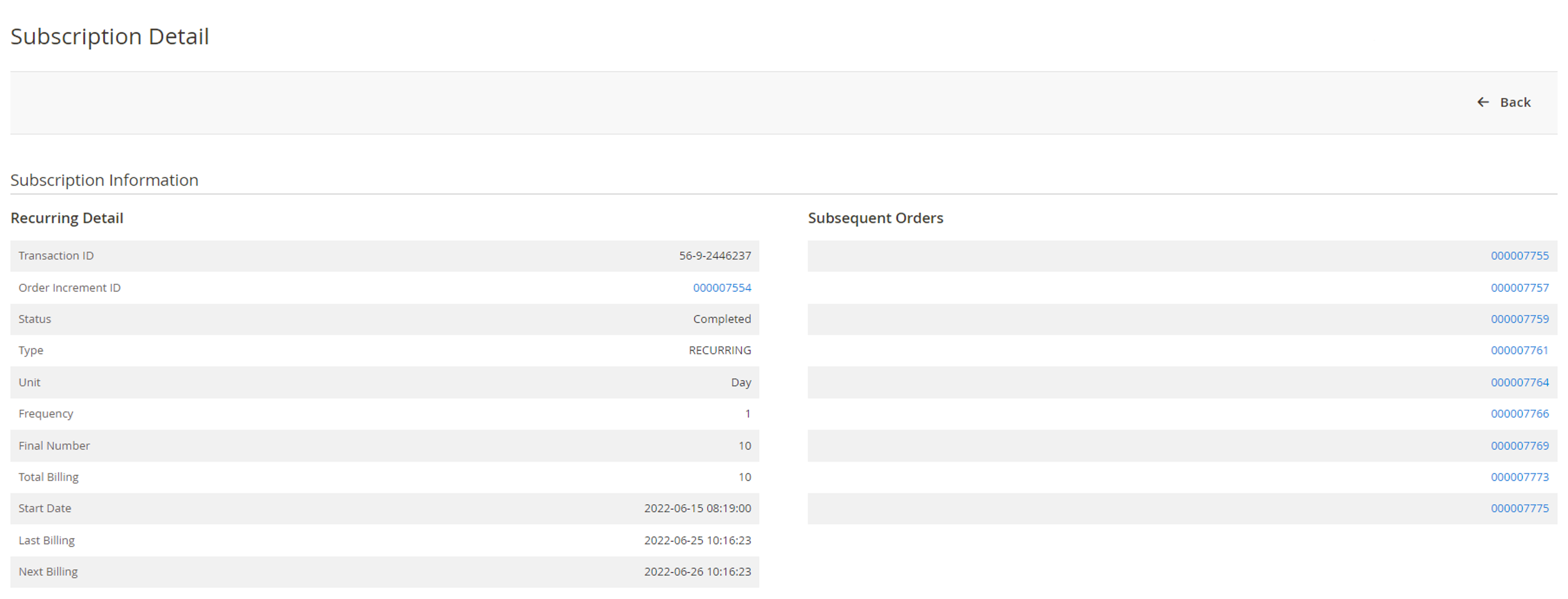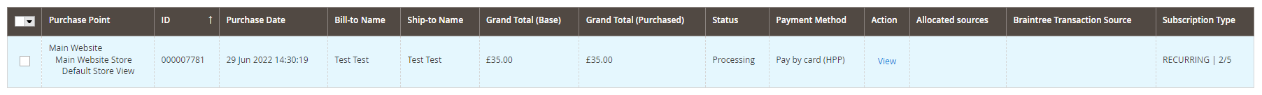 View: You can view the subscription details and the subsequent orders created (as shown below) by selecting “View” for a given subscription.