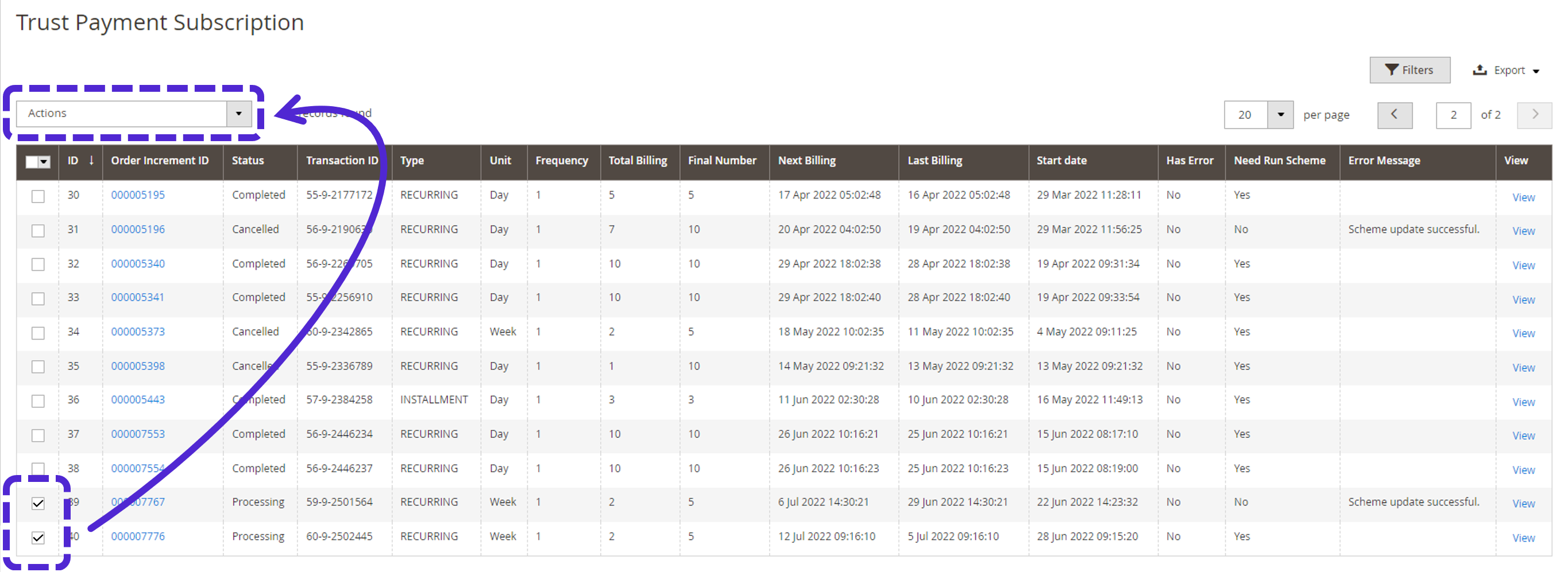 2. You can select one or more subscriptions using the checkboxes on the left of the table, and then select "Cancel" from the "Actions" drop-down in the upper-left to cancel subscriptions in status "Processing". You can also select "View" on the right side of the table for a given subscription to view further details.