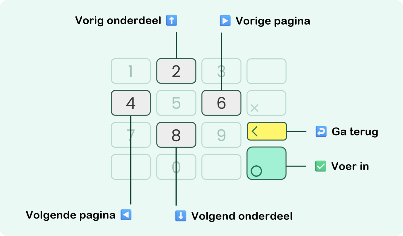 Het toetsenbord is een alternatieve manier om door de terminal te navigeren zonder het aanraakscherm te hoeven gebruiken. Het wordt ook gebruikt voor het invoeren van PIN's, SSID's, wachtwoorden en andere alfanumerieke gegevens. De belangrijkste functietoetsen worden hieronder uitgelegd.