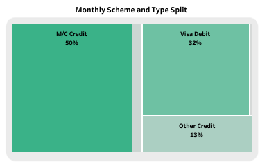The “Monthly Scheme and Type Split” shows, for the full prior month, the distribution of sales volume across the card schemes (currently Visa, Mastercard and "other") and then the debit vs credit card split within that. This can be used to make general inferences about customer type, by showing how your volume is split between Visa and Mastercard.