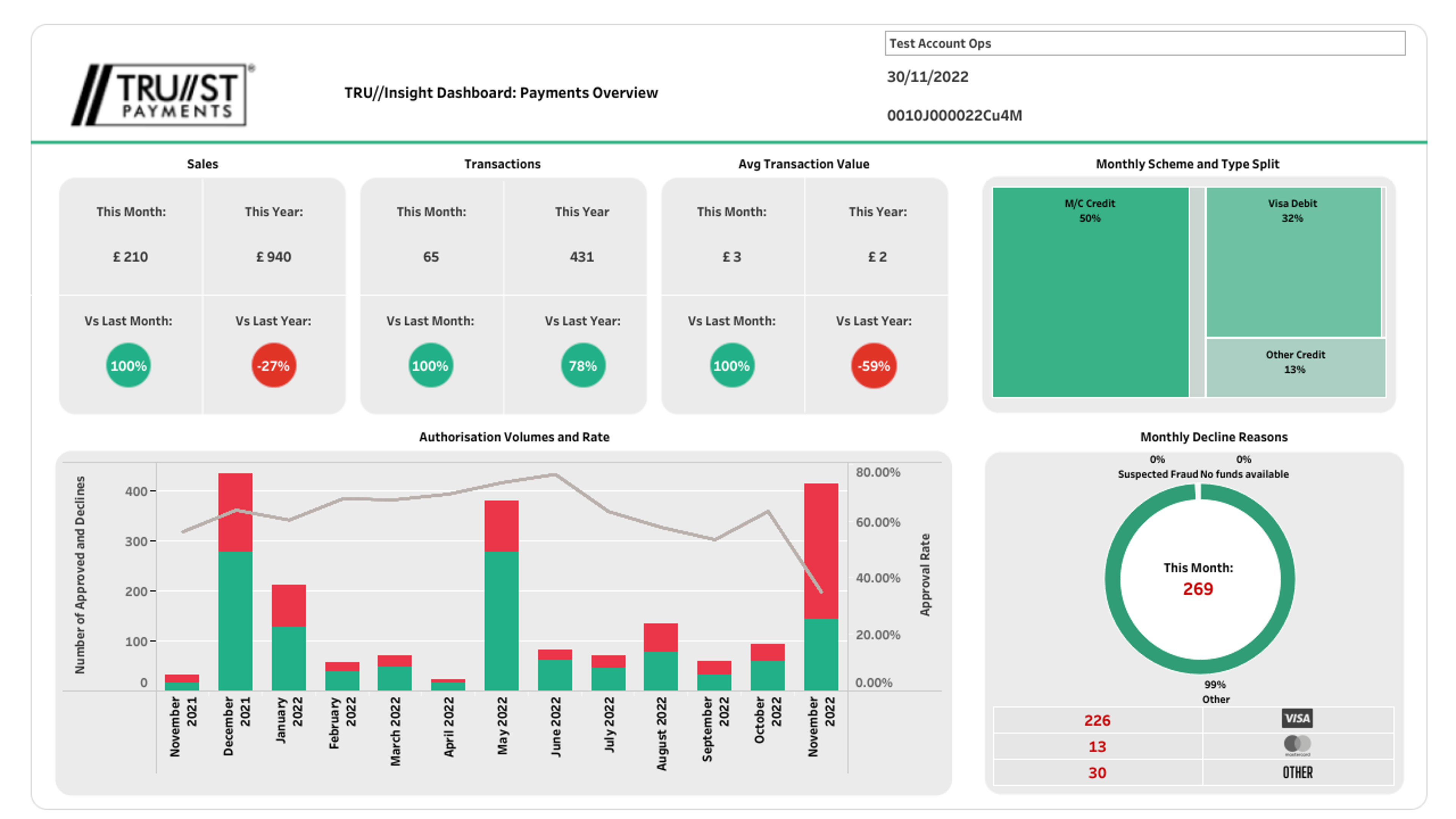This is another key performance indicator and should be reviewed regularly to ensure authorisation rates are within expected ranges and not decreasing, which might indicate higher incidence of fraud, a change in network or issuer processing or other operational issues affecting approvals and therefore revenue.