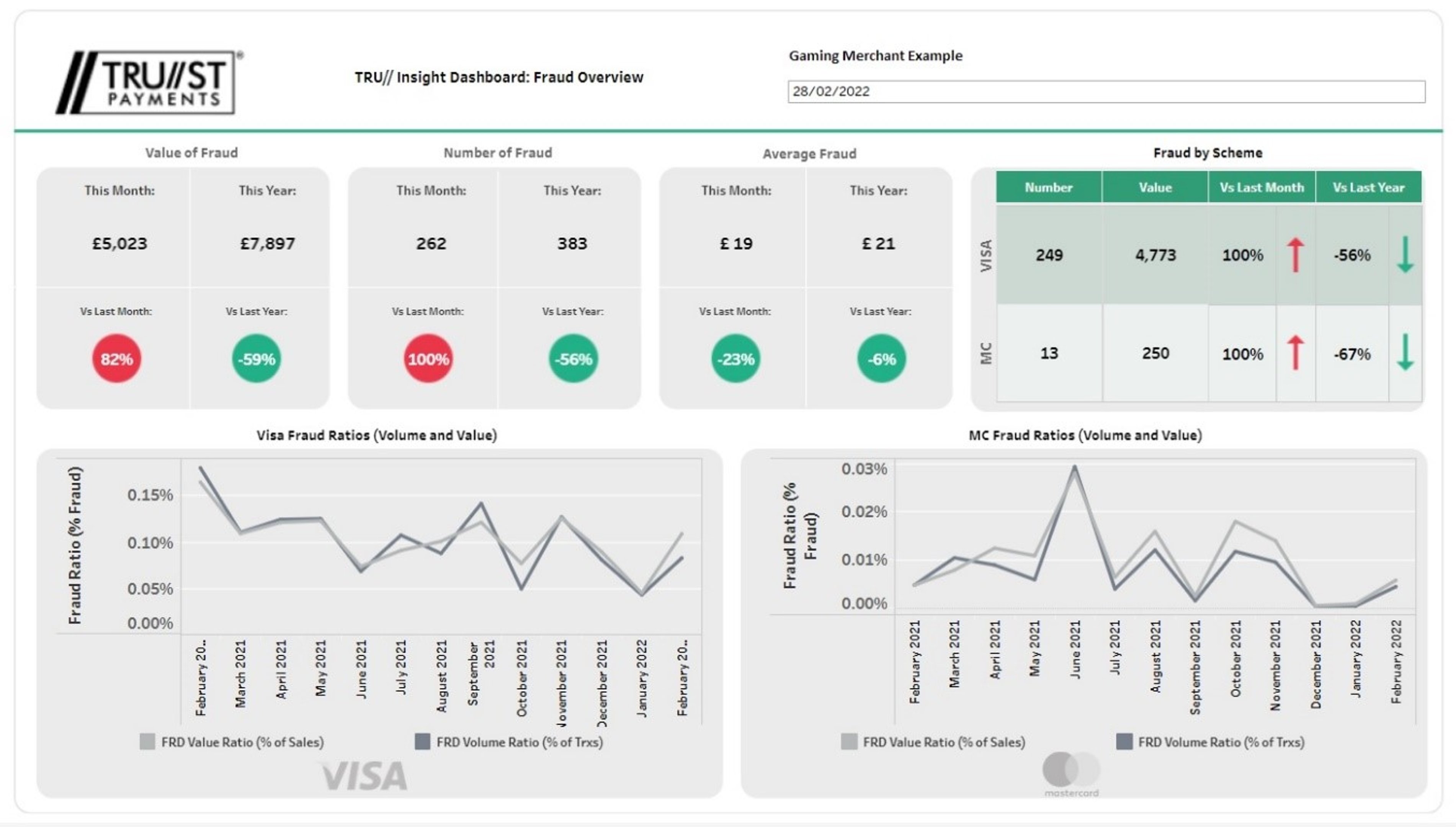The fraud amounts and transactions shown are those reported back to Trust Payments (typically by the issuing bank via the schemes) as suspected fraud, usually based on a claim by the cardholder that they did not authorise the charges and they are suspected to be fraudulent. These are also known in the industry as “TC40” (VISA) and “Safe” (Mastercard) messages.