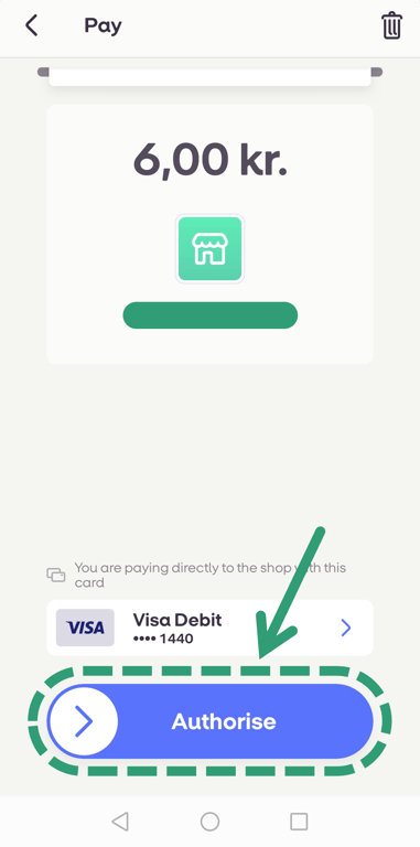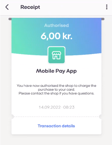 Je hebt 5 minuten de tijd om de MobilePay test app te openen en de lopende betaling goed te keuren. U krijgt het volledige transactiebedrag te zien, de naam van uw winkel en een optie om uw voorkeurskaart voor de betaling te kiezen (dit zijn testkaarten die door MobilePay voor testdoeleinden worden verstrekt).