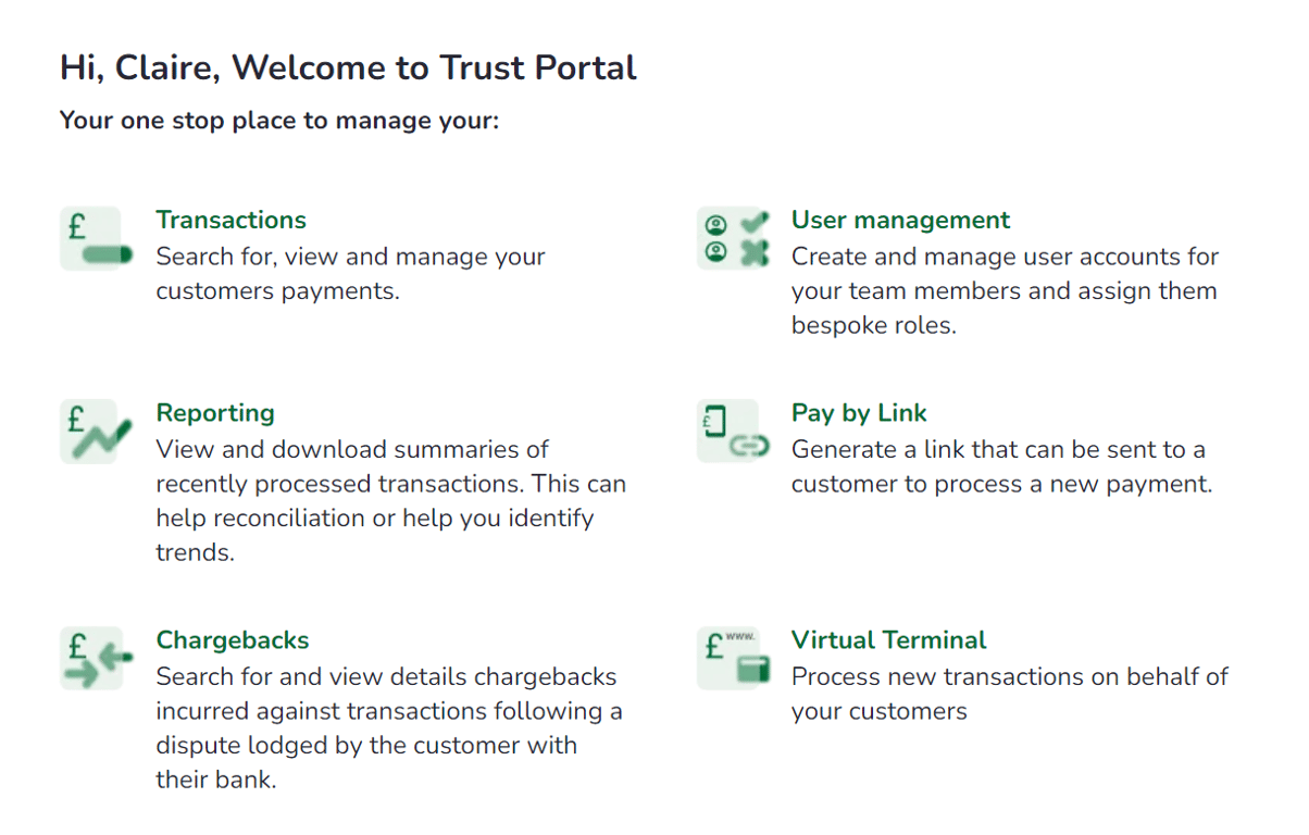 You can always return to your home page by selecting the Trust Payments logo in the top left.