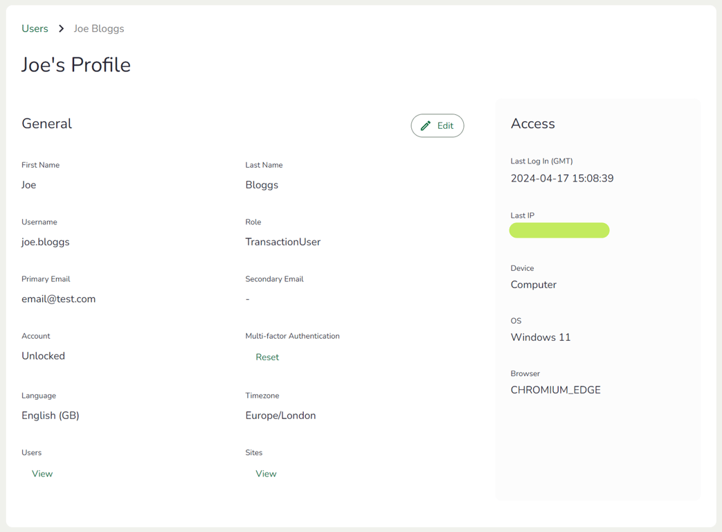 Select "View" to see a list of the user's allocated site reference(s) / access group(s). Any Trust Payments Merchant Id(s) (MID) associated with allocated site references can also be accessed by the user. |