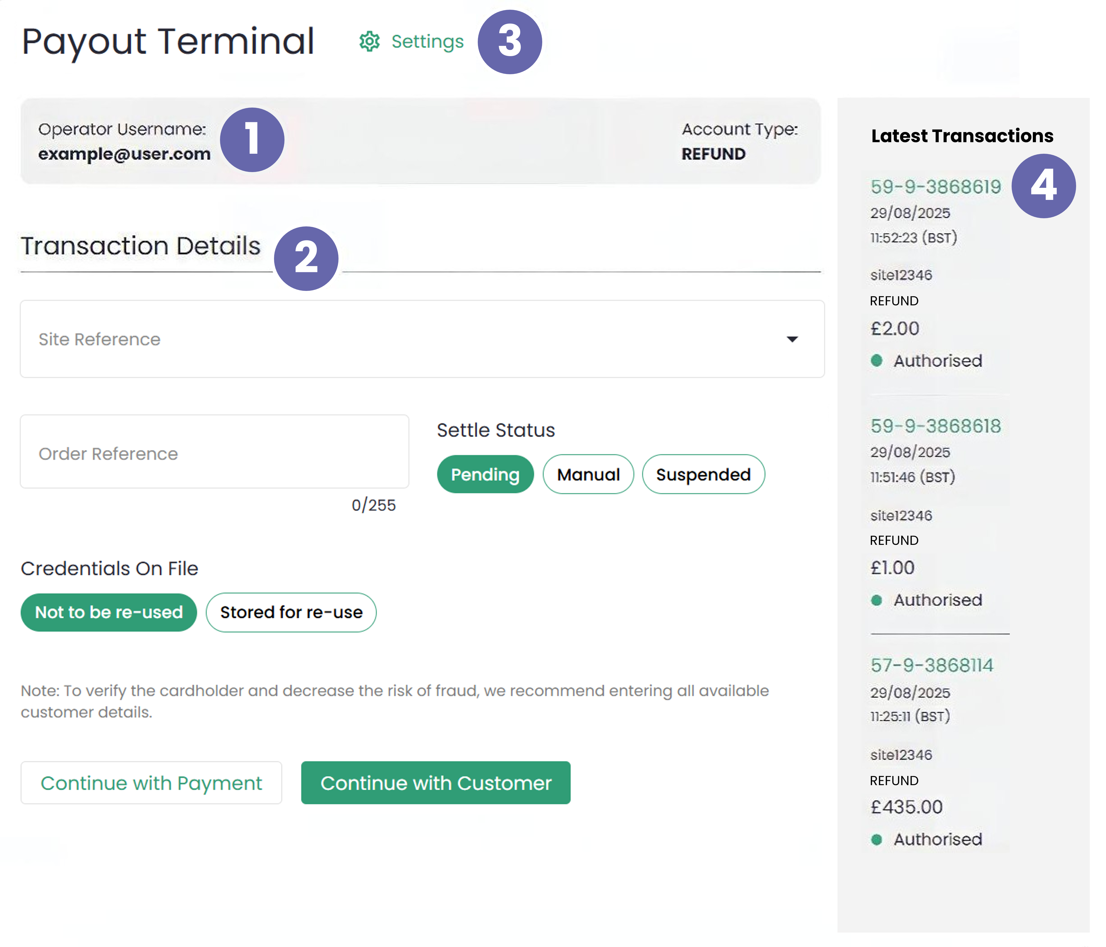 In order to use the “Payout Terminal” you will need a CFT Merchant Id. If you do not have one and would like to make use of this facility, please contact our Support Team.